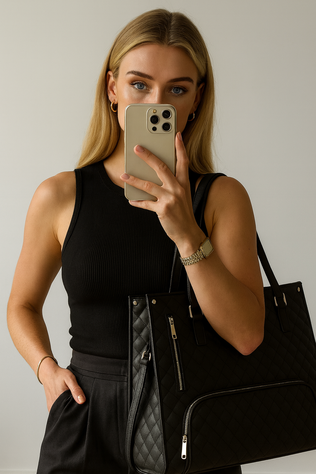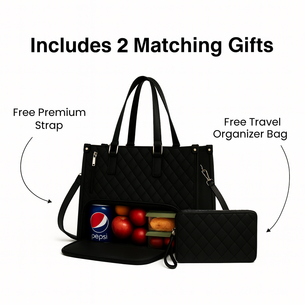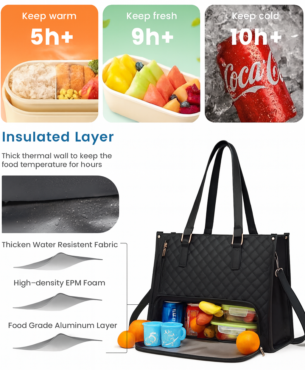 Elevate your daily routine with this chic tote bag, expertly designed for style and practicality. Keep your meals fresh while carrying your laptop, all in one sophisticated accessory.